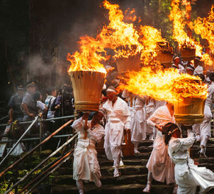 En el Festival del Fuego de Nachi, enormes antorchas llameantes descienden por el santuario de Nachi en un impactante ritual de purificación, reflejando la energía de su cascada sagrada.